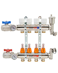 The CB Supplies manifold, available with 1″ or 1 1/4″ headers, is ideal for the hydronic calibration of radiant floor heating systems. It comes complete in the box eliminating the confusion with necessary add-on parts. It is also assembled and mounted on brackets and therefore can go from the box to the wall making its installation simple and fast. Each manifold is equipped with supply and return isolator valves complete with two thermometers for supply and return temperature monitoring. The supply header is equipped with flow gauges simplifying the system calibration. The return header is controlled by manual shutoff valves or can be coupled to electro thermal actuators for the automatic control of the environment temperature. It is also equipped with two automatic air flow vents for air purging. The fill and purging ports are equipped with ball valves simplifying these two operations.